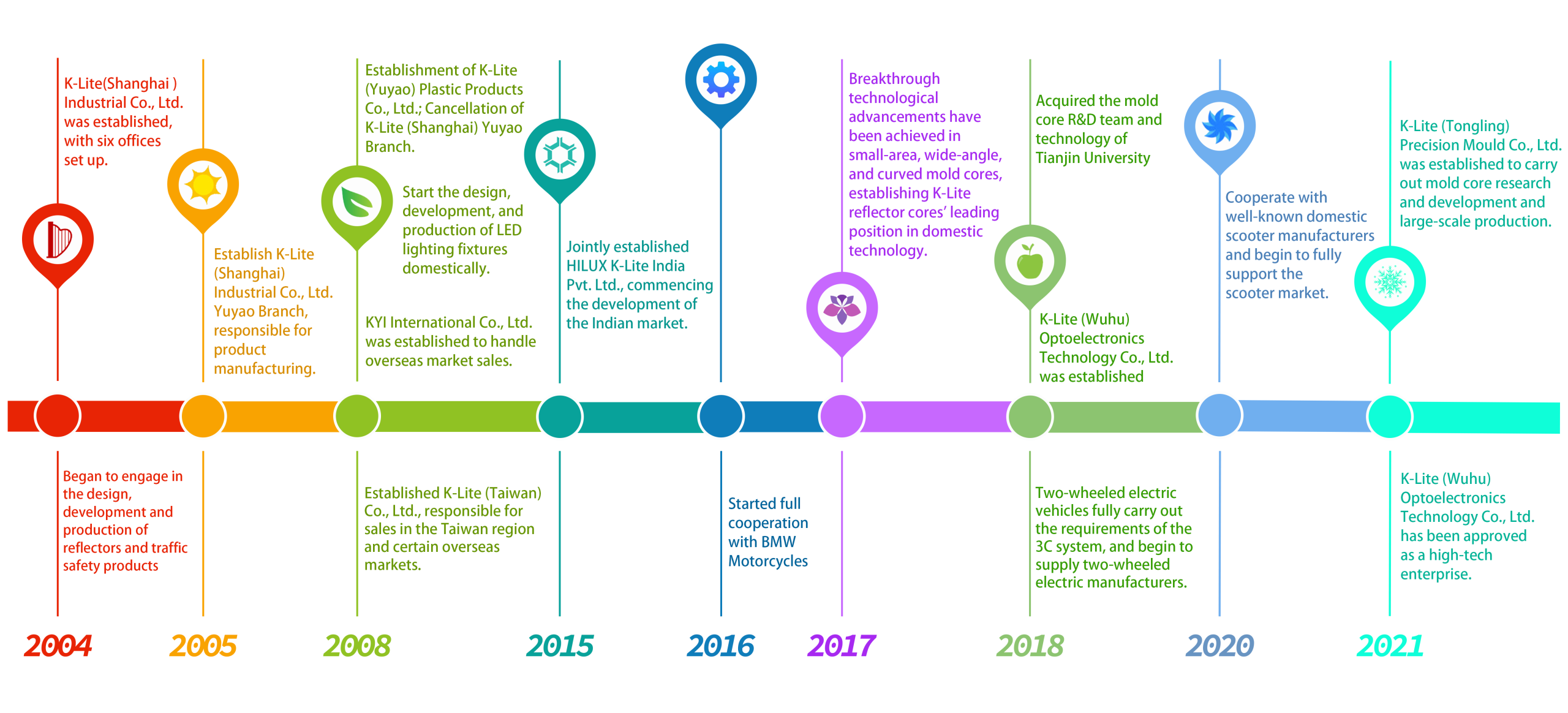 Founded in 2004, K-lite(Shanghai) Industrial Co., Ltd. is a diversified development company integrating the design, development and production of traffic safety reflective products, automotive LED lamps, recovery reflectors, automotive light guide strips and electroforming mold cores.